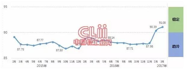 中國輕工業(yè)經(jīng)濟(jì)運(yùn)行及預(yù)測預(yù)警系統(tǒng)數(shù)據(jù)顯示:2017年3月份中輕景氣指數(shù)為91.08,較上月提高0.69點(diǎn),該指數(shù)自今年年初重回綠色“穩(wěn)定”區(qū)間,說明本年開年,輕工業(yè)經(jīng)濟(jì)運(yùn)行有企穩(wěn)回暖態(tài)勢(shì)。