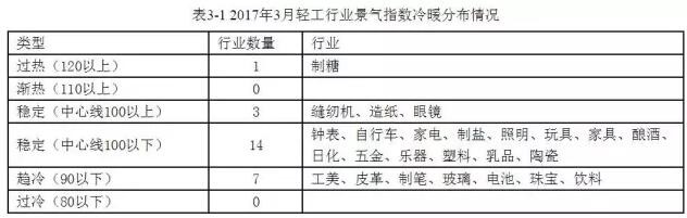 2017年3月,中國輕工業(yè)信息中心對(duì)全國輕工行業(yè)25個(gè)行業(yè)進(jìn)行監(jiān)測,制糖行業(yè)景氣度波動(dòng)較大,由去年末“過冷”區(qū)間躍升到“過熱”區(qū)間;照明電器行業(yè)在“穩(wěn)定”區(qū)間;工美、皮革、制筆、玻璃、電池、珠寶、飲料等行業(yè)處于“趨冷”區(qū)間。整體行業(yè)景氣情況如下:02