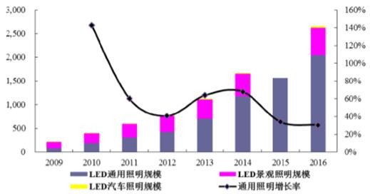 ? ? LED照明產(chǎn)品日益普及,今后也將有數(shù)百億的市場持續(xù)得到釋放。根據(jù)中國產(chǎn)業(yè)發(fā)展研究院數(shù)據(jù)顯示,2014-2016年,我國LED照明應(yīng)用行業(yè)規(guī)模由1,683億元增長至2,678億元,年均復(fù)合增長率為26.17%。其中,LED通用照明規(guī)模由2014年的1,169億元增長至2016年的2,040億元,年均復(fù)合增長率為32.08%;2016年LED通用照明規(guī)模占比達(dá)到47.60%,是市場發(fā)展的主要推動(dòng)力。