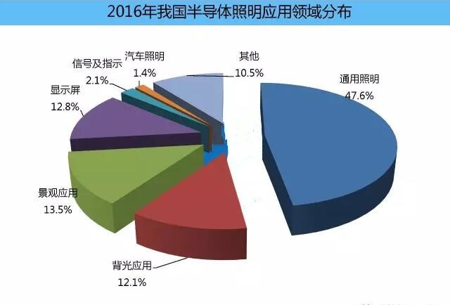 LED通用照明仍然是應用市場的驅動力。2016年,產值達2040億元,同比增長31.5%,占整體應用市場的比重由2015年的45%,提升到2016年的47.6%。