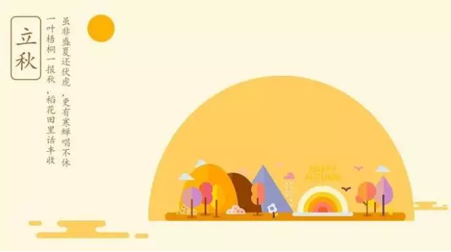 立秋,是二十四節氣中的第13個節氣,更是干支歷未月的結束以及申月的起始;時間在農歷每年七月初一前后(公歷8月7-9日之間)。"秋"就是指暑去涼來,意味著秋天的開始。到了立秋,梧桐樹開始落葉,因此有"落葉知秋"的成語。從文字角度來看,"秋"字由禾與火字組成,是禾谷成熟的意思。秋季是天氣由熱轉涼,再由涼轉寒的過渡性季節,立秋是秋季的個節氣。