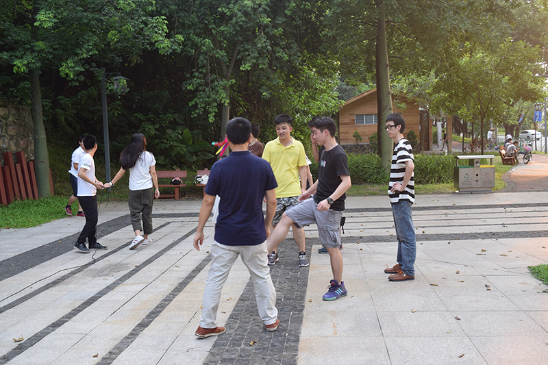 游戲關(guān)是由位位隊(duì)員開始踢滿5個(gè)然后交由下一位隊(duì)友,依次類推,快全部成員踢滿毽子數(shù)的隊(duì)伍——藍(lán)隊(duì)獲得這輪勝利并獲得精美禮品一份。這一關(guān)主要考驗(yàn)我們反應(yīng)速度和體力。
