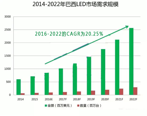 ? 得益于巴西政府和地方政府對(duì)LED照明產(chǎn)品的推廣,據(jù)TechSci Research統(tǒng)計(jì),2016年巴西LED市場(chǎng)需求規(guī)模為8.48億美元,預(yù)計(jì)2022年將增長(zhǎng)至25.62億美元,實(shí)現(xiàn)20.25%的年復(fù)合增長(zhǎng)率。