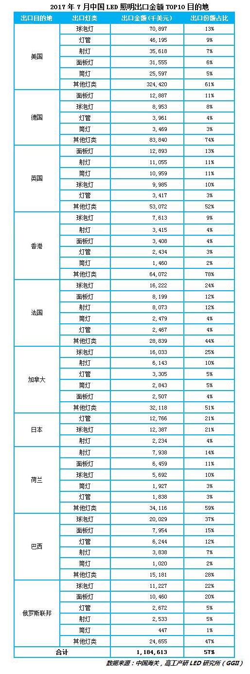 ?? GGII發布的《2016-2017年中國LED照明出口月度監測報告》數據顯示,2017年7月中國LED照明出口總額達20.9億美元,較上月增長21%。總體來看,自前面3-6月份出口市場行情下傾以來算是一大增長的整體態勢。