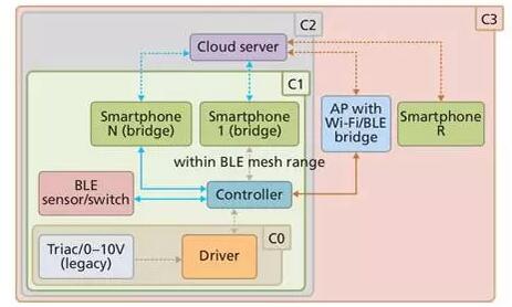 ? 智能手機(jī)控制通??梢苑譃槿齻€層次:C1,C2和C3,在大多數(shù)情況下,C0是目前在用的傳統(tǒng)控制方案(圖2)??梢赃x擇現(xiàn)有的驅(qū)動程序添加一個專用控制器,在C0頂部裝上BLE傳感器或開關(guān),這樣可以直接控制,無需云服務(wù)器。在C1模式下,多個智能手機(jī)控制可以讓用戶與其他人一起分享照明控制。