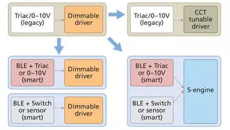 ? 類似地,相同的技術(shù)可以應(yīng)用于開關(guān)和傳感器上,將大多數(shù)現(xiàn)有組件轉(zhuǎn)換為智能組件,同時保留其原有設(shè)計中的一些組件。使用向后兼容的智能驅(qū)動程序,現(xiàn)有的控制器可以匹配新的CCT可調(diào)驅(qū)動程序。此外,LED模塊、驅(qū)動器和控制器可以合并成單板(或稱為S引擎),以將成本降低到可接受的水平。