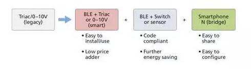 ? 下面舉一些無縫智能照明的例子,決策者看到后,會減少相應(yīng)阻力,并加速智能照明的廣泛采用,如圖3所示。在美國,LED照明廠商可以安裝可調(diào)光驅(qū)動器來改善LED照明或繼續(xù)使用傳統(tǒng)的調(diào)光器,比如三端雙向可控硅或0-10V。使用現(xiàn)有的LED照明系統(tǒng),可以添加BLE調(diào)光器或BLE智能調(diào)光器,以此替代三端雙向可控硅/ 0-10V調(diào)光器,這使得智能手機(jī)在住宅空間中能更加靈活地使用遙控技術(shù)。
