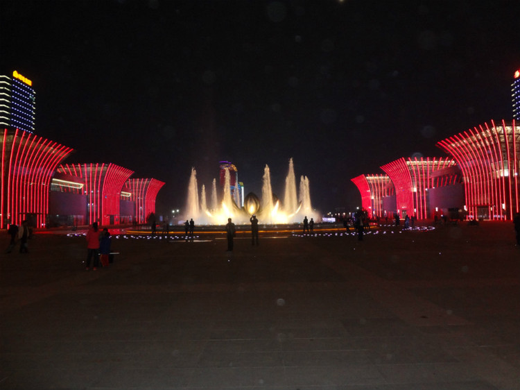 伴隨著濟南西站東廣場——“禮樂廣場”。據了解,“禮樂廣場”面積約7公頃,為高鐵東站房、南北綜合體建筑和站東路的圍合區域。“T”形廣場中軸體現“禮”和“樂”主題,以古代青銅器“樽”與古代樂器“琴”為原型設計的綜合體建設已經基本完工。廣場中心宛如“和氏璧”的荷花噴泉水池的噴水設備已經交付使用。濟南東廣場亮化 濟南西站 濟南西站廣場