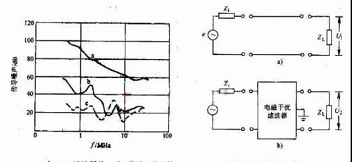 設置電磁干擾濾波器加入前后傳輸?shù)截撦d上的噪聲電壓分別為U1和U2,計算公式是20lgU1/U2。