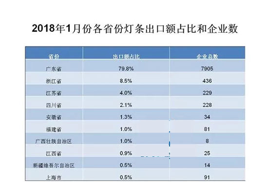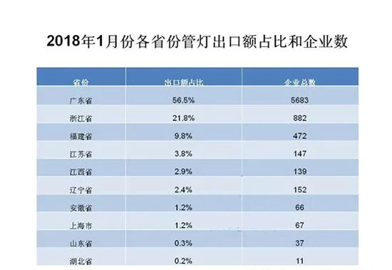 三、廣東依然是管燈和燈條出口的龍頭省份