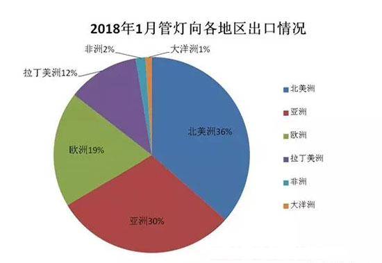 燈港照明|2018年1月份我國管燈出口總額超過1.4億美元,同比增長約44%,環比下降約4%,占一月出口總額的約12%。分析各地區出口情況,北美洲依然是我國管燈出口的大市場,占據了36%的份額,亞洲和歐洲也分別達到了30%和19%。相比于2017年12月份,出口北美洲和亞洲的總額出現小幅下降,而歐洲市場和非洲市場均實現接近20%的增長。
