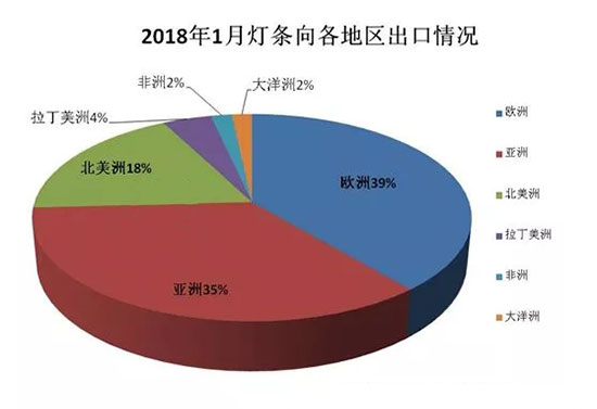 燈港照明|燈條方面,2018年1月份較2017年12月總額和占比均略有下降,其中出口總額由17年12月份的7236萬美元下跌到7000萬美元以下,但同比依然保持增長趨勢。具體看各地區市場,除拉丁美洲外,其余環比均出現下跌,其中大洋洲市場出現接近35%的跌幅。占比情況來看,歐洲和亞洲依然是大市場,分別占據39%和35%,北美洲總口額占比小幅上漲,達到18% 。