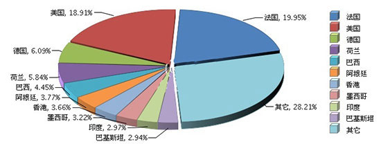 2017年,湖南照明行業完成累計出口額1.42億美元,同比增長15.54%。出口額排在前五位的國家依次是法國、美國、德國、荷蘭和巴西。其中:法國完成累計出口額0.28億美元(占19.95%),同比增長4912.02%;美國完成累計出口額0.27億美元(占18.91%),同比增長42.95%。