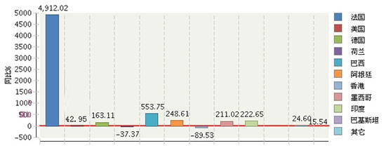2017年1月~12月湖南照明行業累計出口額主要貿易國同比增長情況(燈港照明)
