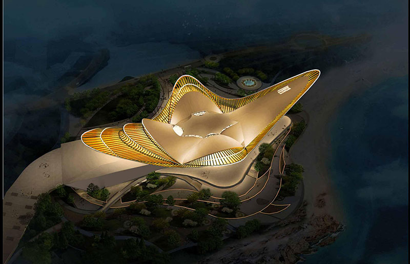 工程建筑面積31313平方米,其中地上8層,建筑高度66米。首層為設備用房及服務用房,層高6米。“鳳凰”的頭頸部匯集餐飲服務,在距地面52米處為設立蹦極平臺;腹部開放綜合餐飲和娛樂大廳;背部為可供游客游覽的綜合廣場;尾部規劃為可容納1200人的國際一流歌劇院。