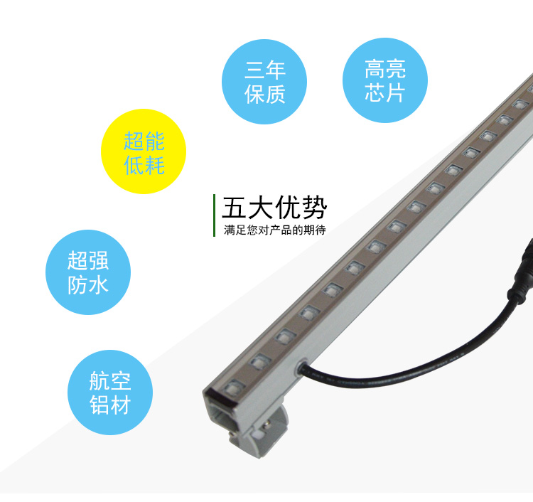 3、LED大功率洗墻燈光源采用進(jìn)口超高亮大功率LED燈珠,內(nèi)置恒流驅(qū)動電源,確保燈具性能穩(wěn)定。